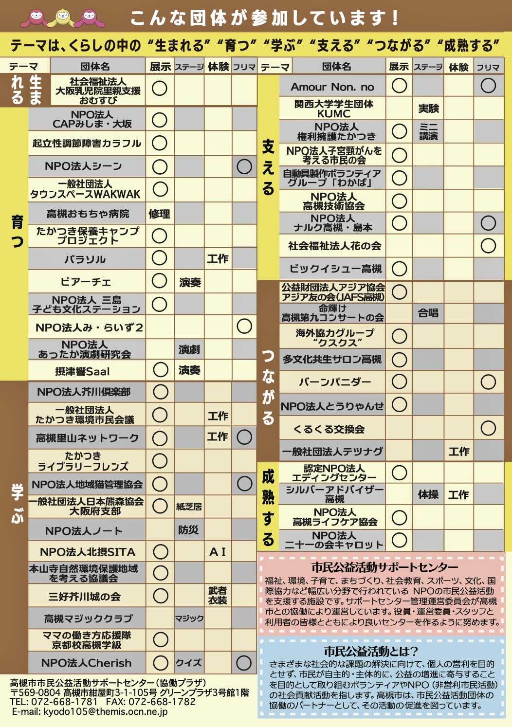 おもちゃ病院を開設しておもちゃ修理をするほか、工作コーナーや、大阪医科薬科大学看護学部のまちの保健室もあります。