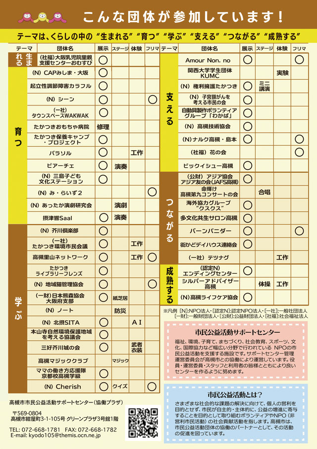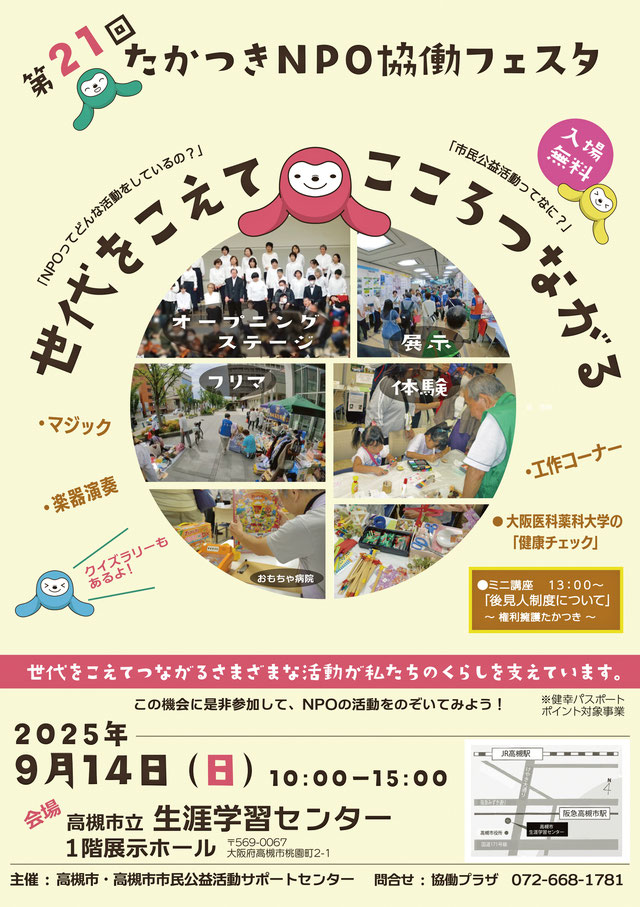 9月14日に高槻生涯学習センター1階展示ホールで第21回たかつきNPO協働フェスタを行います。